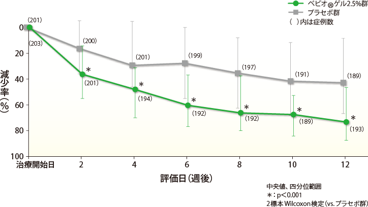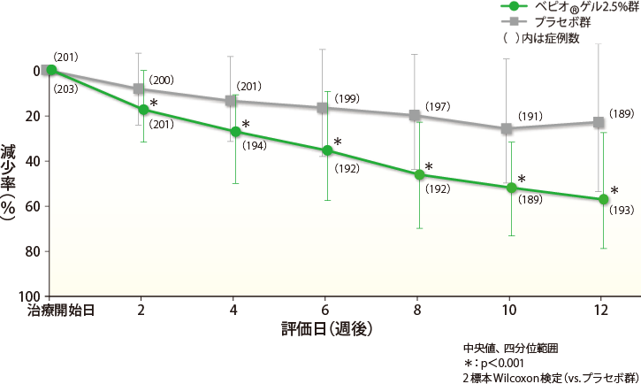 - 赤ニキビ(炎症性皮疹)の平均減少率は、2週後が36.4%、4週後が48.1%、6週後が60.4%、12週後が73.3%であった。