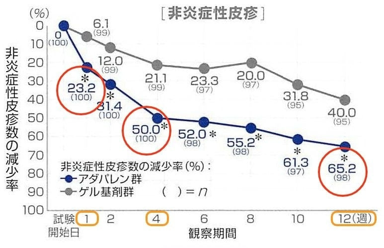 - 白ニキビ(非炎症性皮疹)の平均減少率は、1週間後23%、1カ月後50%、3カ月後65%。
