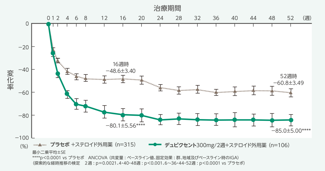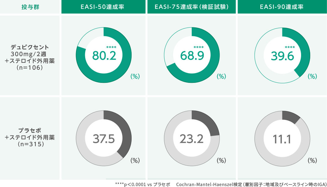 EASEスコア(湿疹病変の面積と重症度の指標)が著名に改善した。「EASI-50達成」とは、「EASEスコアが50%以上低下」すること。