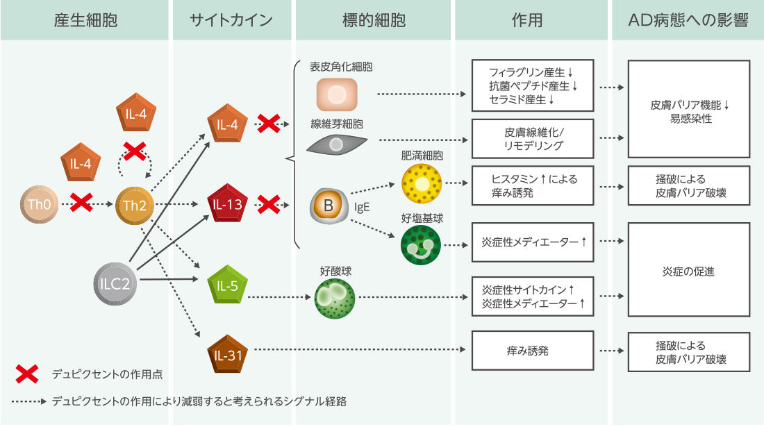 この過剰な警報システムは、「インターロイキン4 (IL-4)」と「インターロイキン13 (IL-13)」という2種類の情報伝達物質(サイトカイン)によって維持されています 。これらの物質が細胞に「炎症を起こせ」「かゆみを生じさせろ」といった指令を絶えず送り続けているのです。