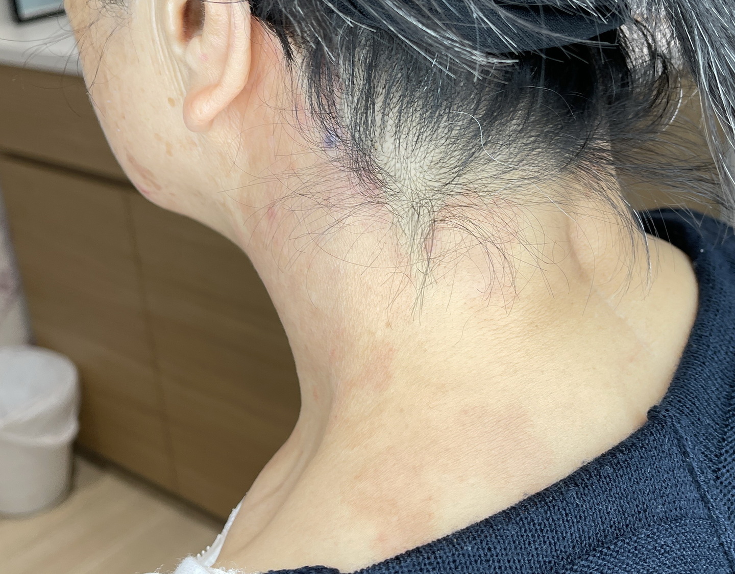 | 2週間以降 | 紫斑はほぼ消失し、元の肌色に戻る。一時的に色素沈着(茶色み)が出ることがある。 | 継続的な保湿と遮光を行う。 | |
