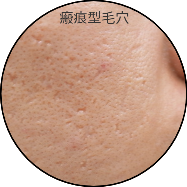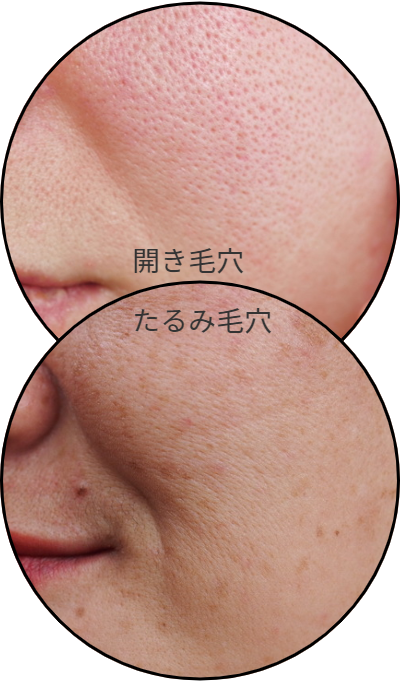 - 毛穴が開いている「瘢痕毛穴(ニキビ跡など)」「開き毛穴」「たるみ毛穴」。