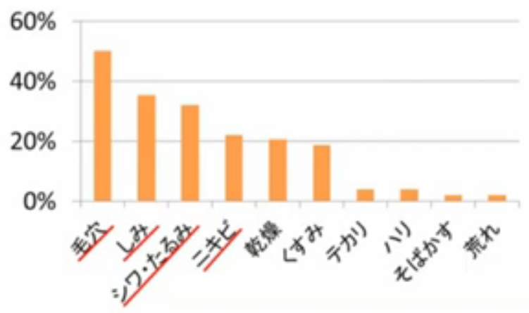 ロート製薬が行った、20~70歳代の女性を対象にしたお肌の悩みアンケートでも、毛穴の悩みが最も多い結果でした。