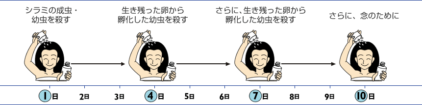 | 2日目 | (通常の洗髪) | 薬効を逃れた卵の一部が孵化し、幼虫が生まれ始める。 | |