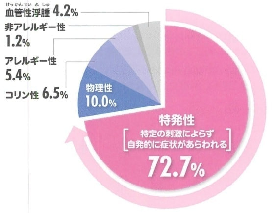 そのうち7割以上の患者さんは、特別な原因・誘因がなく、自発的に症状があらわれる「特発性じんましん」です。