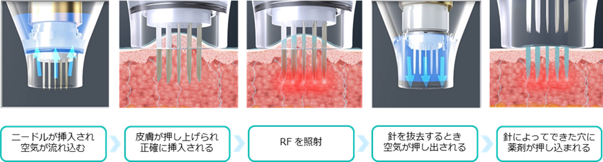 微細な針を皮膚へ刺入し、針先からRFを照射することで皮膚表面に熱損傷を起こすことなく、皮膚内部に直接熱エネルギーを与えます。