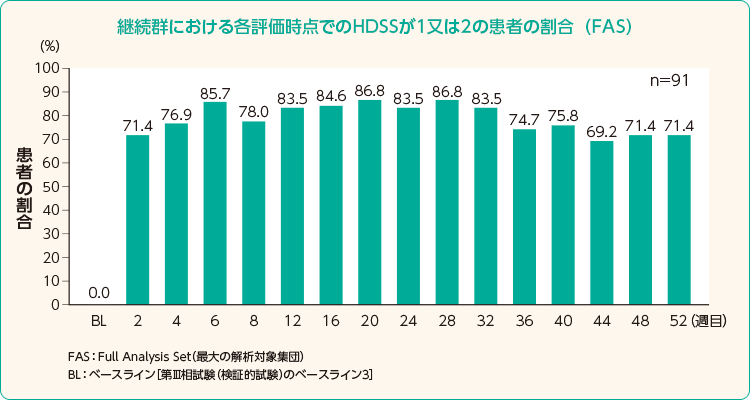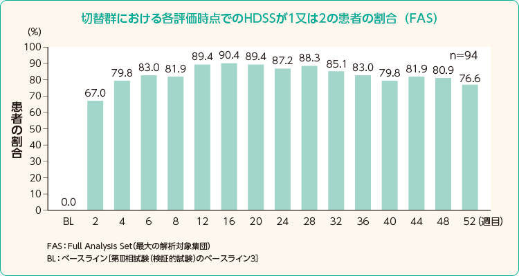 HDSS(自覚症状スコア)が2点以下割合が、移行後2週目で切替群67.0%、継続群71.4%、移行後6週目で切替群83.0%、継続群85.7%、移行後24週目で切替群87.2%、継続群83.5%、移行後52週目で切替群76.6%、継続群71.4%。