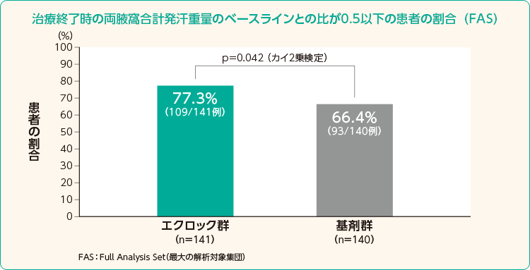 | 患者 | 先行する第Ⅲ相試験から移行した、12歳以上の日本人の原発性腋窩多汗症患者185例 切替群:第Ⅲ相試験(検証的試験)において、基剤群であった患者集団 継続群:第Ⅲ相試験(検証的試験)において、エクロック群であった患者集団 |