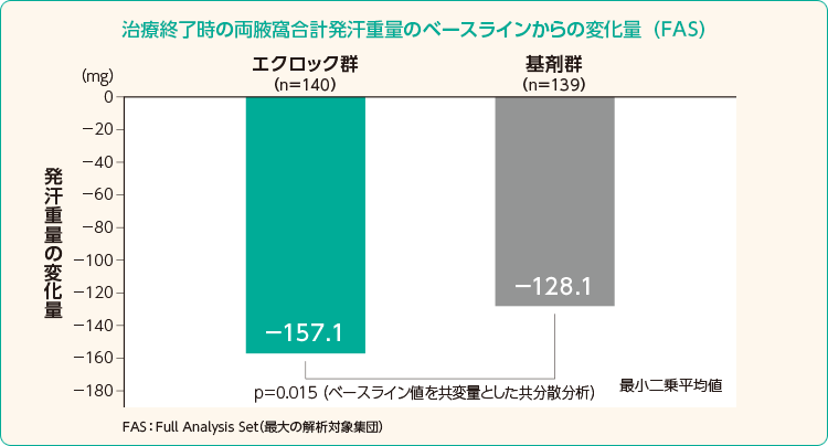 | 患者 | 12歳以上の日本人281人 HDSS(自覚症状スコア)が3点以上(1~4点) スコア3︓発汗はほとんど我慢できず、日常生活に頻繁に支障がある スコア4︓発汗は我慢できず、日常生活に常に支障がある HDSM-Axスコア(重症度スコア)が2点以上(0~4点) 腋窩発汗量が両側50㎎以上 |