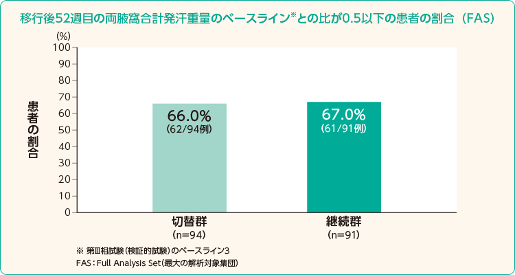 発汗重量が半分以下になった割合が、移行後52週目の両腋窩合計発汗重量のベースライン※との比が0.5以下の患者の割合は、切替群66.0%、継続群67.0%