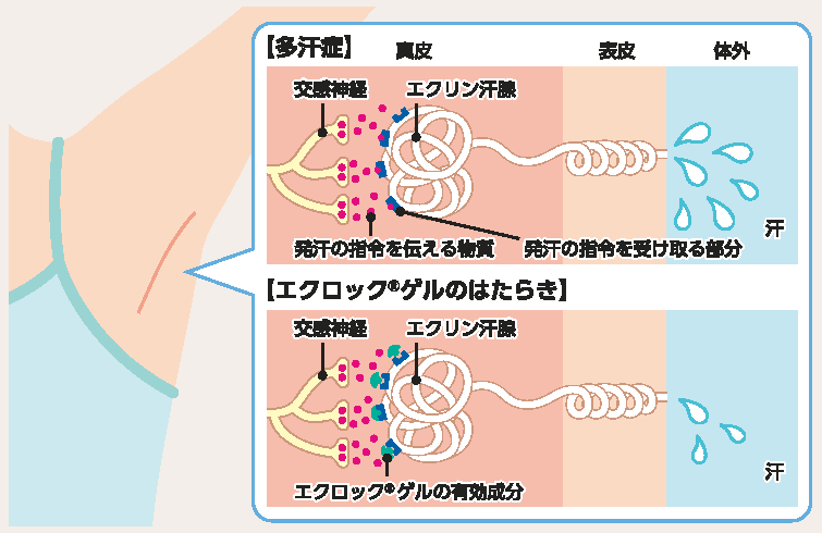エクロックゲルは、ワキの下から過剰に汗が分泌される「原発性腋窩多汗症(げんぱつせいえきかたかんしょう)」の治療を目的として開発された、日本で初めて健康保険が適用される外用薬(塗り薬)です 。